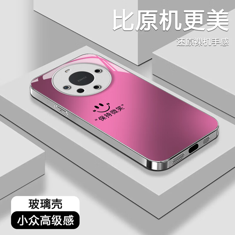 适用于华为Mate60Pro保持微笑全包防摔感磨砂玻璃手机壳QL18 笑脸保持玫粉BL+金属漆玻璃银色 华为 Mate 60 Pro