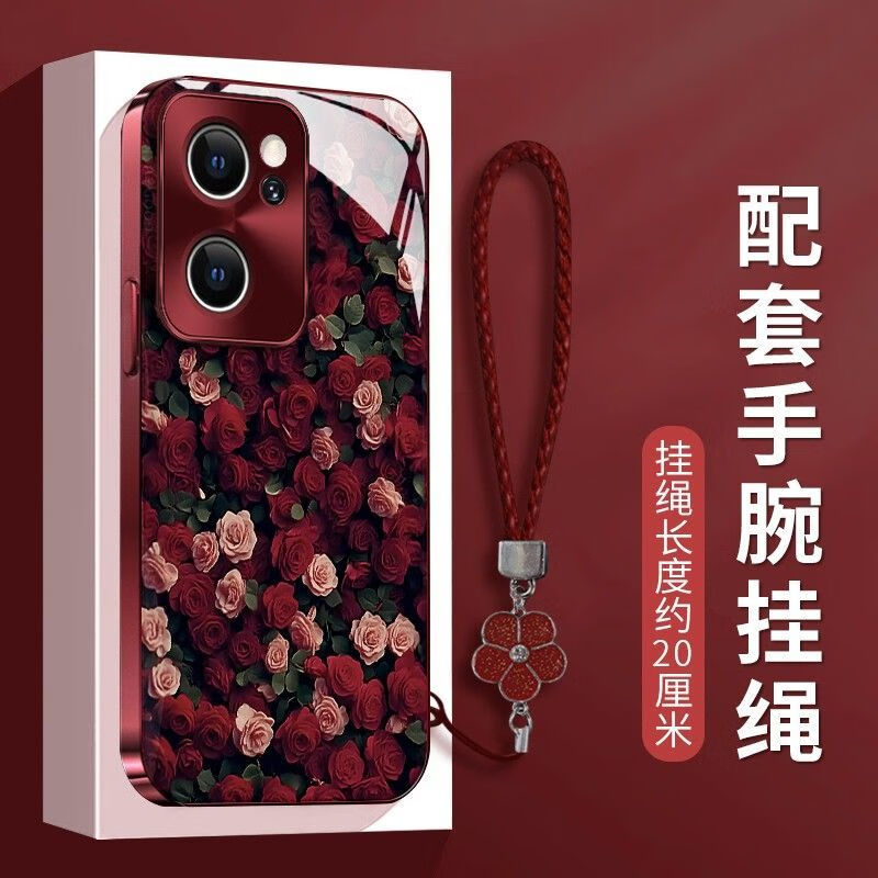 适用OPPO Reno7红玫瑰电镀玻璃壳防摔手机壳女款高级感保护套 电镀玻璃壳-酒红色-红玫瑰+ 五叶花挂绳 oppo reno7