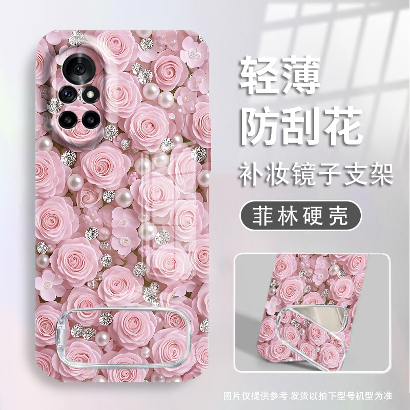 【华为nova8/荣耀v40轻奢版】晶莹圆珠粉玫瑰菲林防摔保护手机壳 菲林-圆珠粉玫瑰+镜子支架 华为nova8