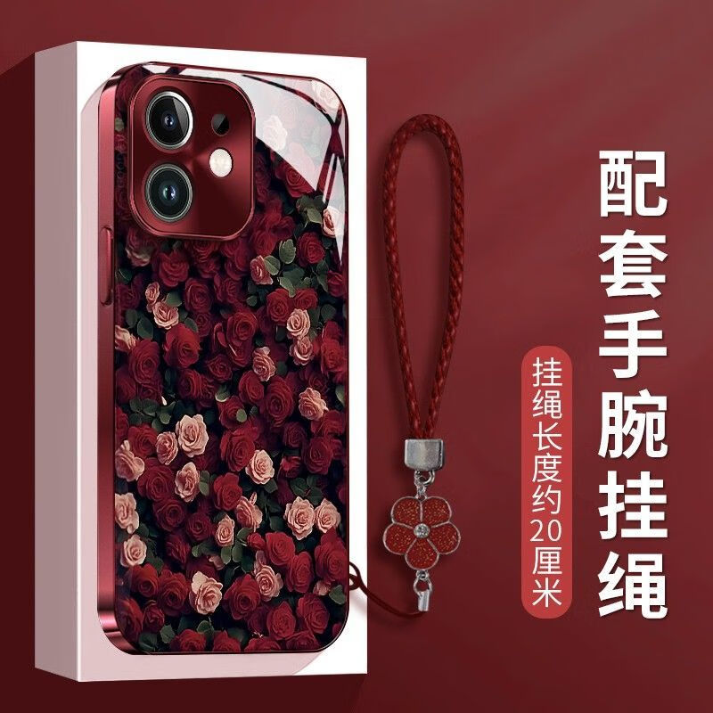 适用于苹果11红玫瑰电镀玻璃壳防摔手机壳女款高级感保护 电镀玻璃壳-酒红色-红玫瑰+ 五叶花挂绳 苹果11