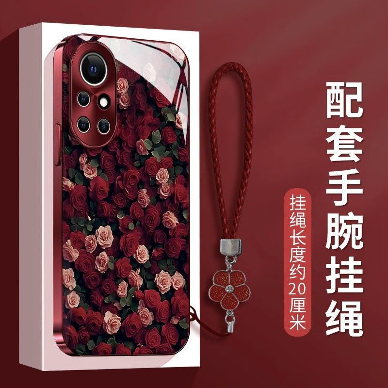 适用于华为Nova8红玫瑰电镀玻璃壳防摔手机壳女款高级感保护 电镀玻璃壳-酒红色-红玫瑰+ 五叶花挂绳 华为nova8