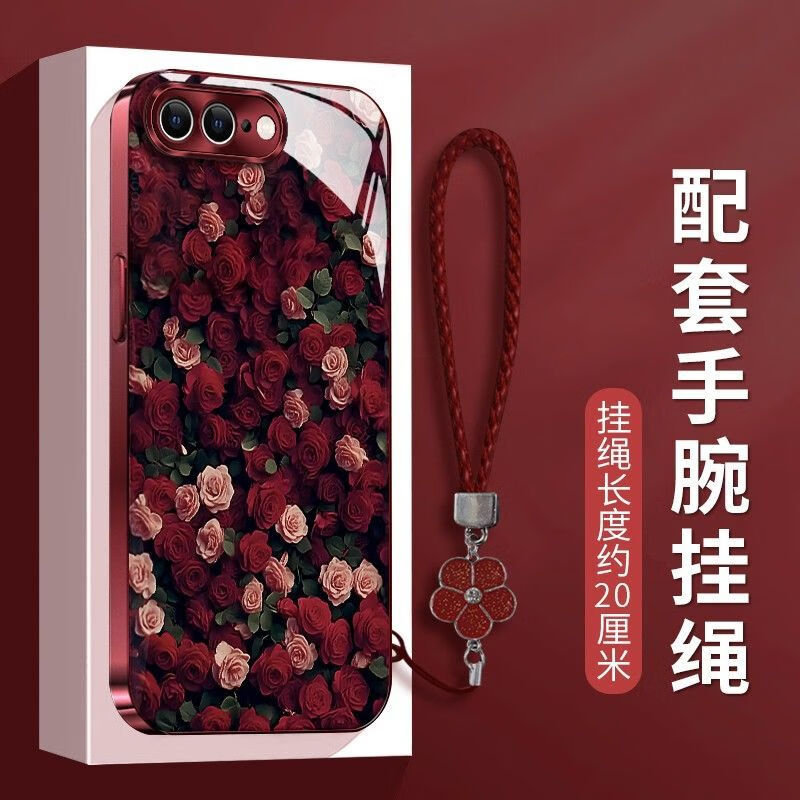 适用于苹果7Plus红玫瑰电镀玻璃壳防摔手机壳女款高级感保护 电镀玻璃壳-酒红色-红玫瑰+ 五叶花挂绳 苹果7plus/8plus(通用)