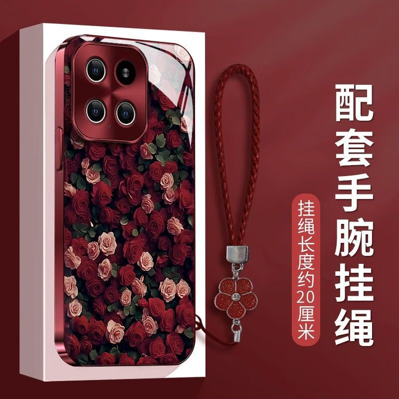 适用于小米15红玫瑰电镀玻璃壳防摔手机壳女款高级感保护 电镀玻璃壳-酒红色-红玫瑰+ 五叶花挂绳 小米15
