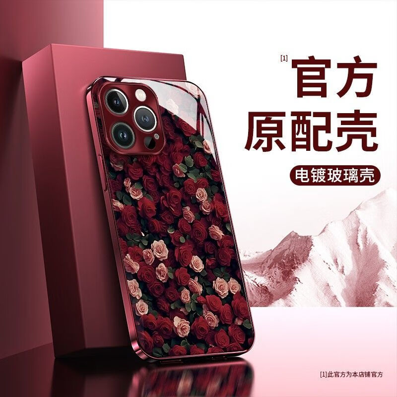 适用于苹果16ProMax红玫瑰电镀玻璃壳防摔手机壳女款高级感保护 电镀玻璃壳-酒红色-红玫瑰+ 五叶花挂绳 苹果16promax
