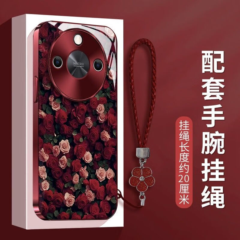 适用于荣耀X50红玫瑰电镀玻璃壳防摔手机壳女款高级感保护 电镀玻璃壳-酒红色-红玫瑰+ 五叶花挂绳 荣耀x50