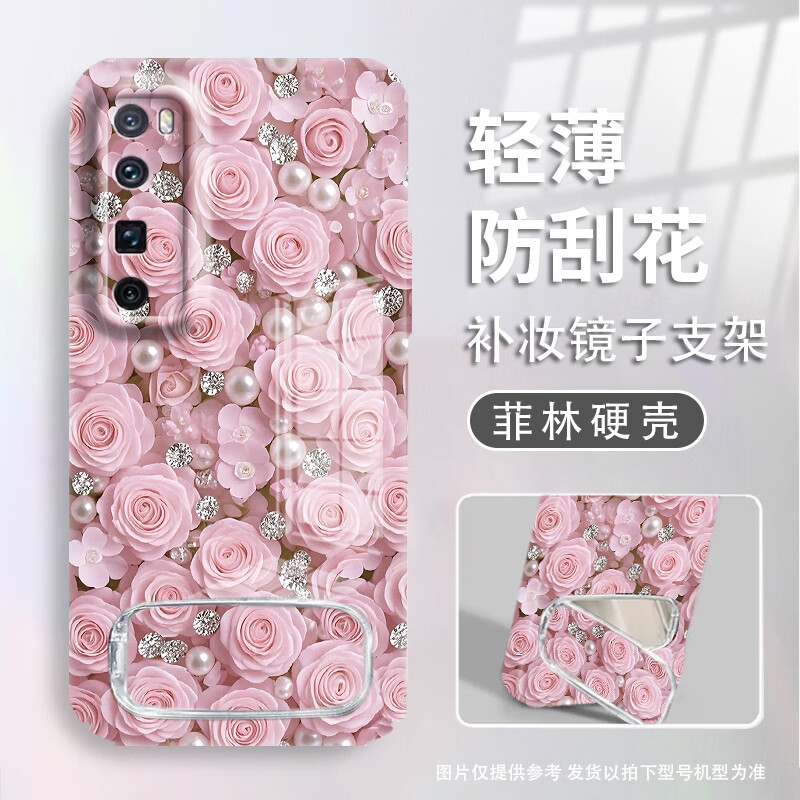 适用【华为nova7pro】晶莹圆珠粉玫瑰菲林防摔保护手机壳 菲林-圆珠粉玫瑰+镜子支架 华为nova7pro