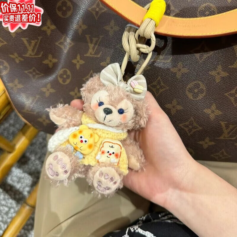 麦思伦(MAISILUN)美拉德雪莉玫毛绒公仔包包挂件汽车钥匙扣达菲熊挂饰情侣礼物 深棕格纹背带咖啡玫【棕钥匙扣绳】