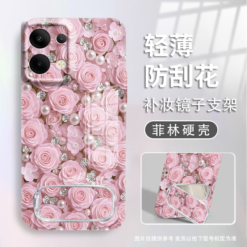 适用【opporeno9pro+】晶莹圆珠粉玫瑰菲林防摔保护手机壳 菲林-圆珠粉玫瑰+镜子支架 opporeno9pro+