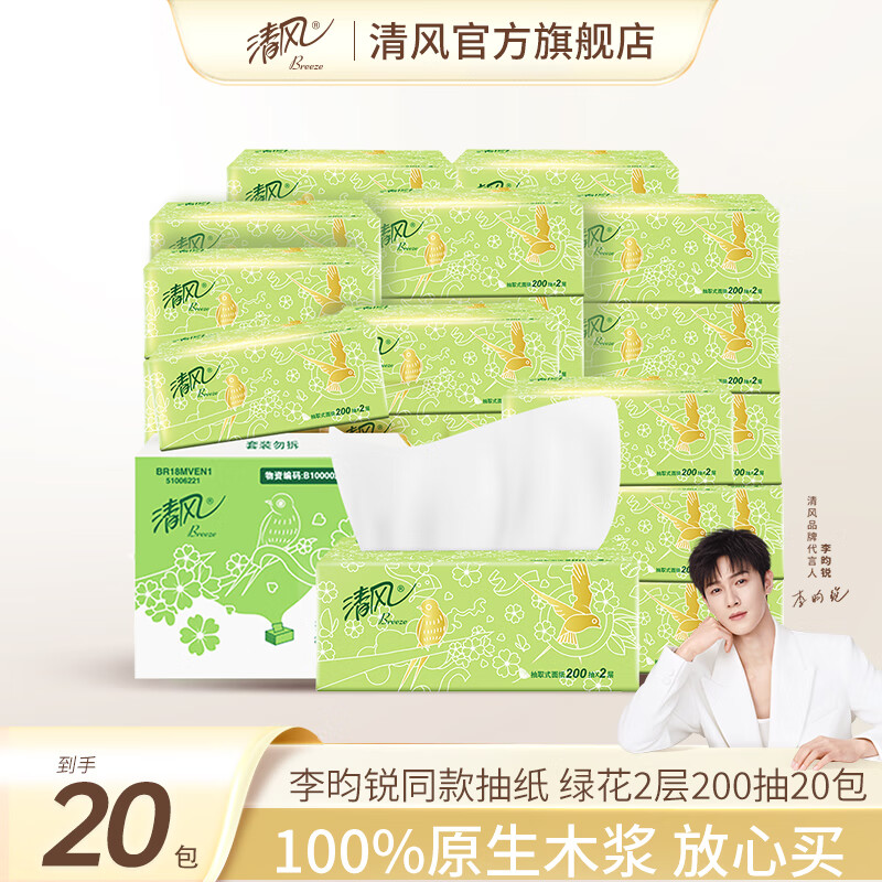 清风抽纸200抽20包 纸巾母婴卫生纸面巾纸吸水纸餐巾纸批发整箱装 2层 200抽*20包 整箱装