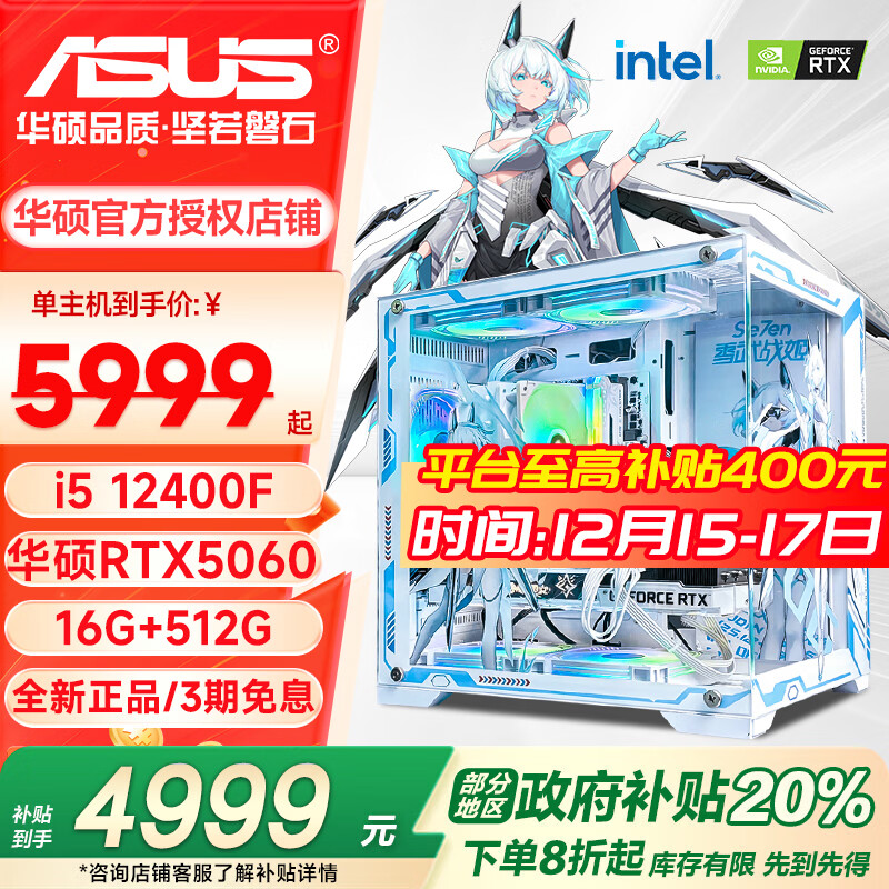 华硕(ASUS)台式电脑主机i5 14600K/5060Ti/5070电竞游戏三角洲打瓦直播整机组装电脑ROG雪舞战姬海景房主机 i5 12400F丨RTX5060丨五