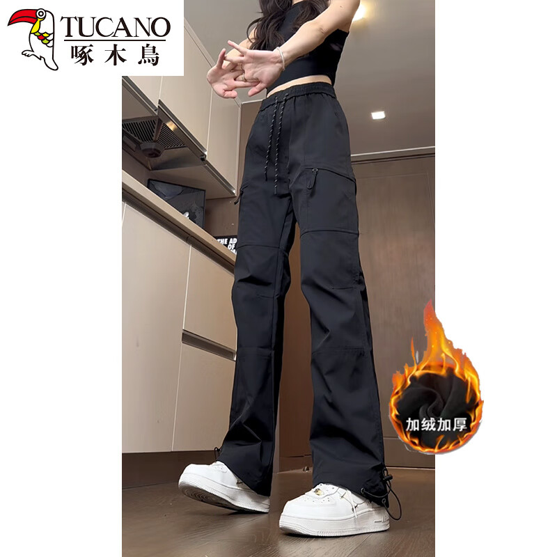 啄木鸟工装裤女2025新款宽松直筒显瘦高腰登山休闲冲锋裤子女装 黑色 加绒 M (90-120斤)
