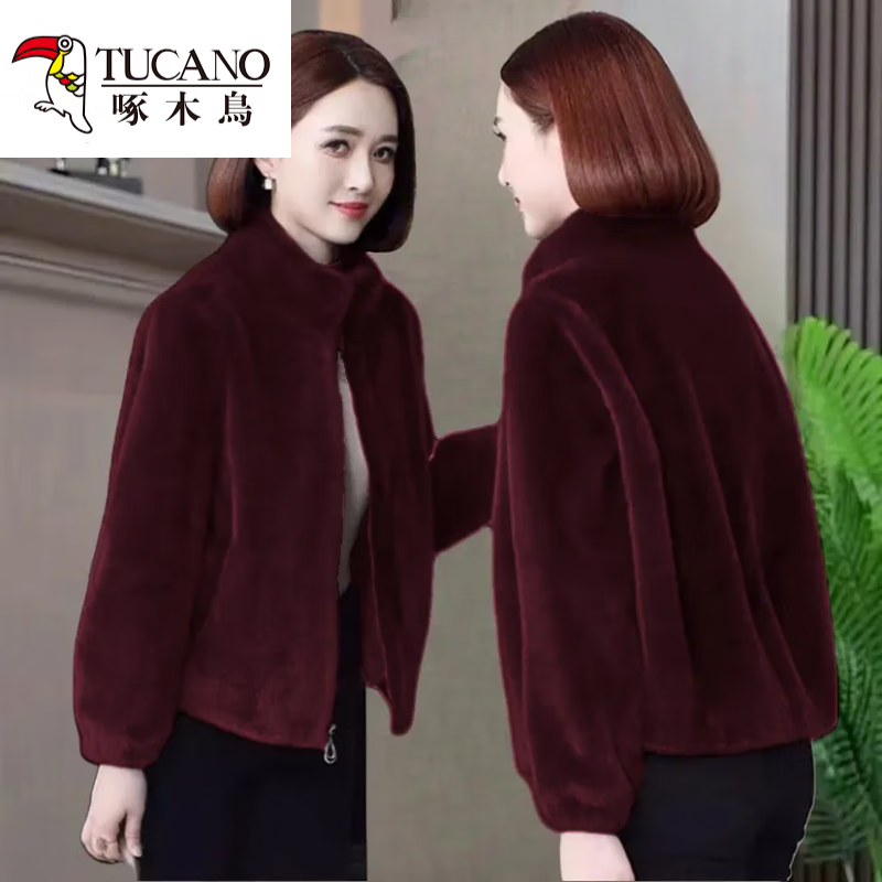 啄木鸟2025秋冬款年轻妈妈洋气皮毛一体短款外套中老年女装仿水貂绒立领 安可拉红 L 建议100--115