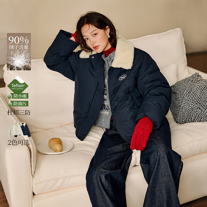 茵曼(INMAN)2025冬季女装新款三防毛绒翻领花苞羽绒服防风宽松短款外套 深宝蓝 S 155-162cm /95-110斤