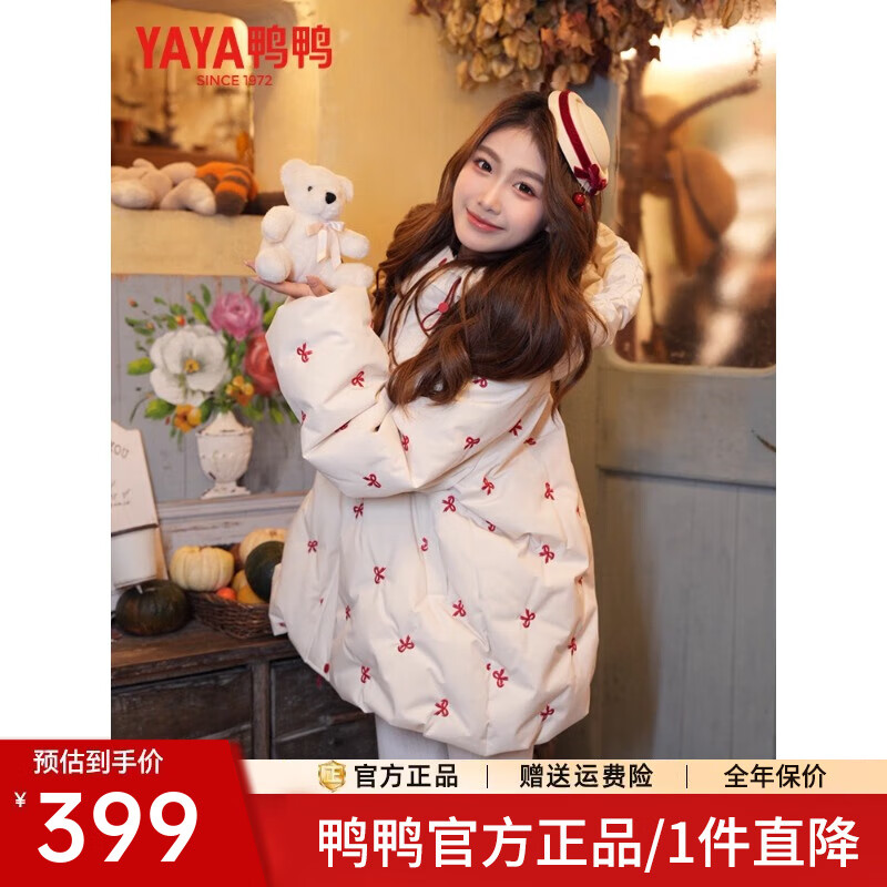 鸭鸭(YAYA)【冰淇淋系列】鸭鸭羽绒服女装中长款2025年冬季新款时尚刺绣外套 米色 M
