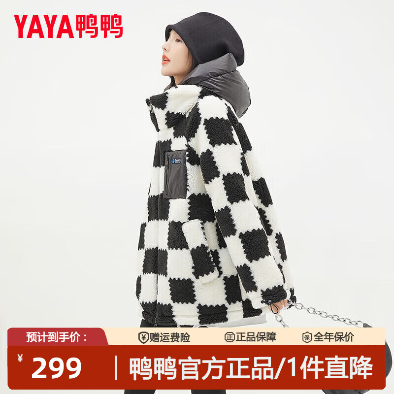 鸭鸭(YAYA)品牌小个子2025冬季新款羊羔绒保暖加厚休闲时尚百搭防寒女装外套 黑白格色 M
