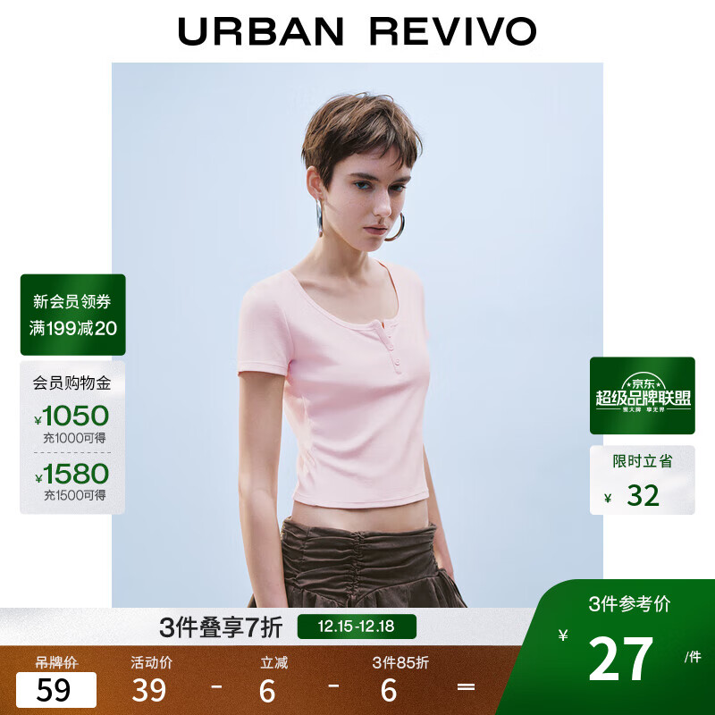 UR2025春季新款女装时尚修身纽扣式U型领短袖T恤UWB450007 水粉 M