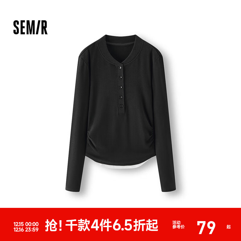 森马长袖T恤女短款发热抓绒假两件2025冬新款亨利领紧身衣服显瘦 黑色90001 L
