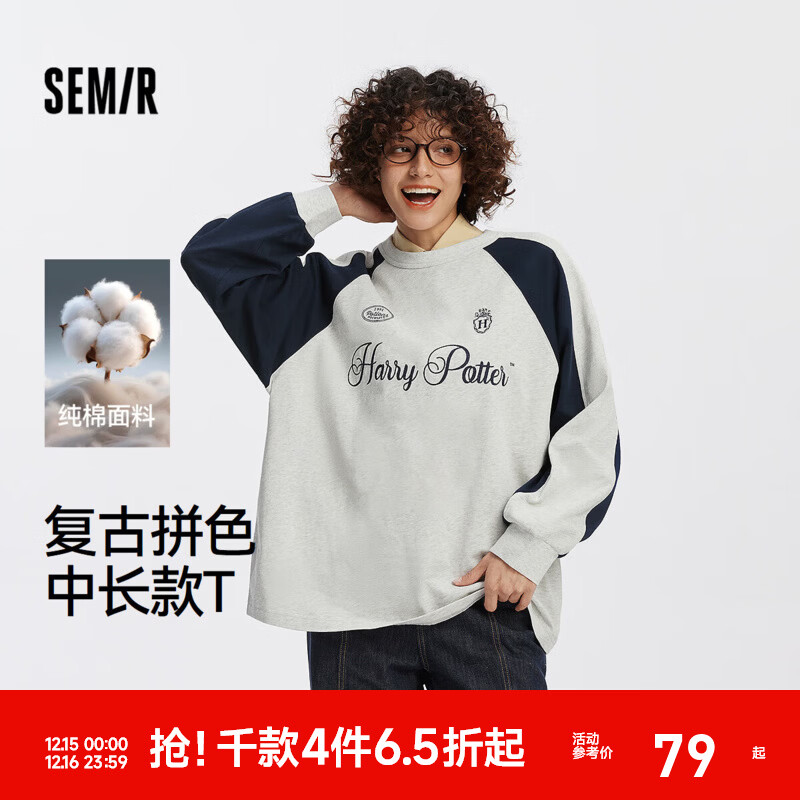 森马(Semir)[商场同款]哈利波特联名长袖T恤女纯棉2025新款oversize秋装 灰蓝色调00328 M