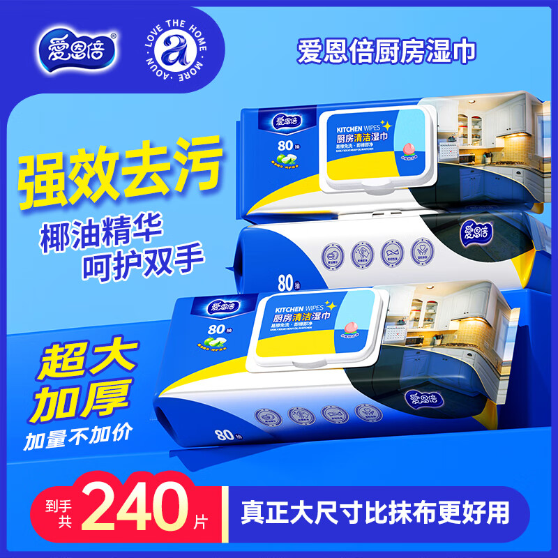 爱恩倍厨房湿巾纸去油污家用油烟机清洁强力去油污湿纸巾加大加厚 80片*3包