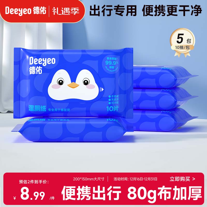 德佑企鹅湿厕纸小包便携10抽*5包 厕纸湿巾洁厕如厕湿纸巾 新客尝鲜