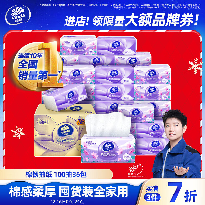 维达(Vinda)抽纸【孙颖莎推荐】棉韧3层100抽*36包S码 亲肤无刺激纸巾 AB混发