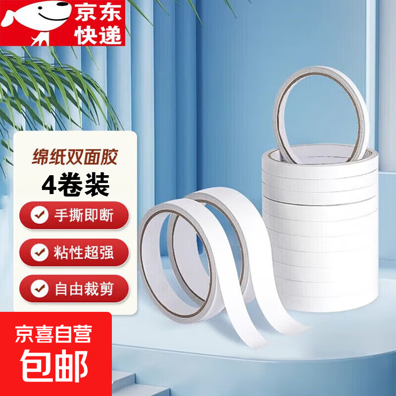 双面胶带易揭型棉纸高粘度手工胶带无痕墙面贴免打孔易剥手撕胶带 宽0.8cm*长7m【4卷】